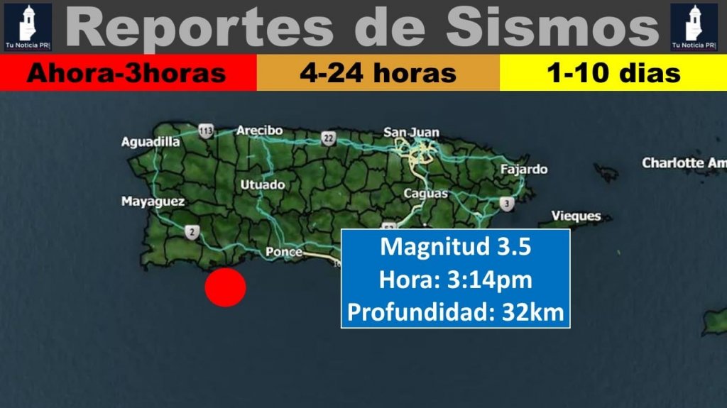 Preliminar la Red sismica de Puerto Rico registró un temblor de magnitud 3.5 a las 3:14pm a una profundidad de 32km No hay Aviso o Vigilancia de Tsunami para Puerto Rico.