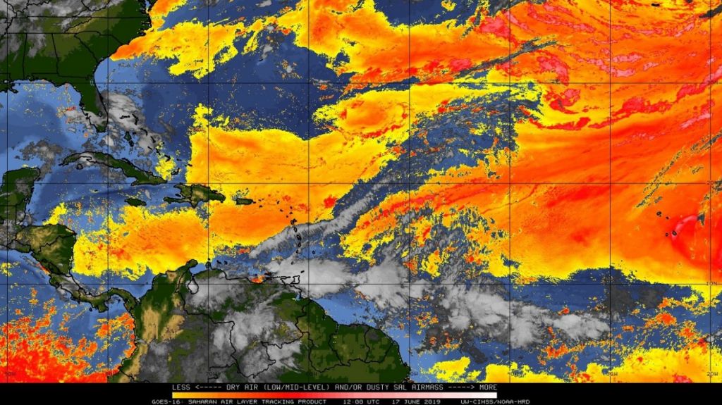 Tiempo mayormente seco y caluroso domina a nuestra zona; también ligeramente brumoso. Hay una masa de aire con mucho material proveniente del desierto, lo cual limita la actividad de lluvia.