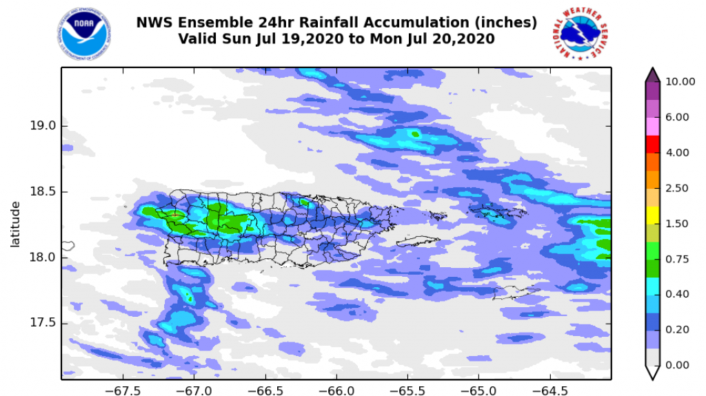 Por otro lado, las condiciones marítimas manifiestan olas de 2 a 5 pies en el Atlántico y de 1 a 4 pies en el mar Caribe. Hay baja peligrosidad de corrientes submarinas en la mayoría de las costas, excepto en playas entre Isabela y Carolina y al este de Culebra. En estas zonas el riesgo es moderado.