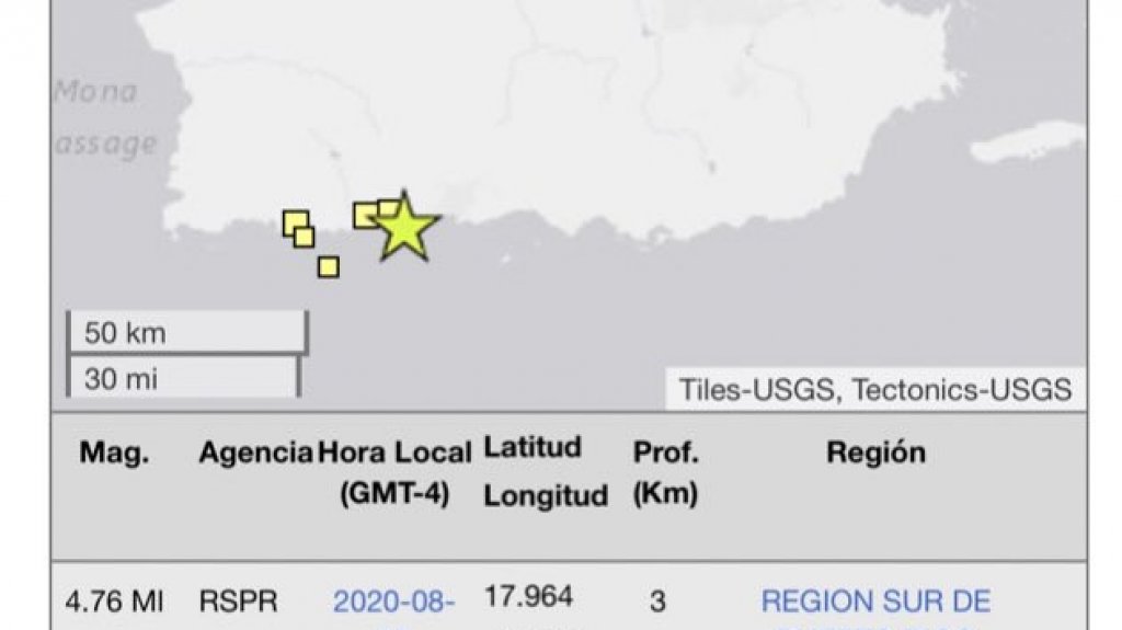 A las 11:27 p.m., un temblor con magnitud preliminar de 4.8 fue reportado como sentido a través de toda la Isla. La Red Sísmica de Puerto Rico detectó el sismo al sur del país, cercano a Peñuelas (en el mar). Por el momento, se estima intensidad máxima de IV (cuatro) en Yauco.