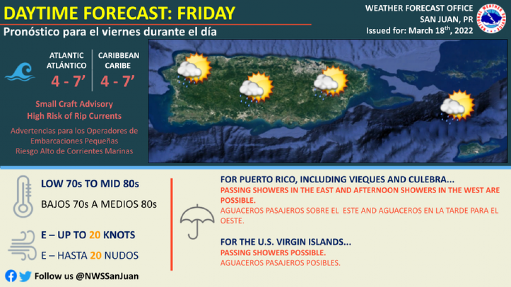 Para hoy, aguaceros de aislados a dispersos, son anticipados en la mañana a través del este y norte de Puerto Rico. Aguaceros aislados son pronosticados para las islas locales en la tarde, a medida que aire más seco entre al área para las horas de media mañana en adelante. La temperatura alta durante el día se espera que este en los medios a altos 80s en las áreas bajas, y en los medios 70s a bajos 80s en las áreas más altas. El viento estará del este de 10 a 20 mph con ráfagas ocasionales.
