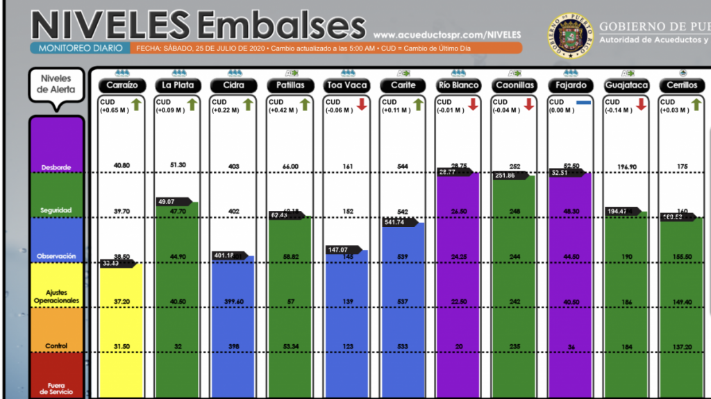 Por otro lado, las condiciones marítimas están deterioradas, manifiestan olas de 6 a 8 pies a través del Atlántico y de hasta 7 pies en el Caribe. Hay moderada peligrosidad de corrientes submarinas en las costas del este y sur de la isla y una peligrosidad alta en playas del Atlántico. Solo las costas entre Añasco y Cabo Rojo presentan baja peligrosidad.