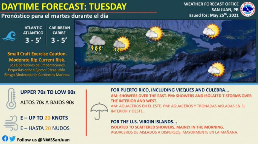 Para este martes en la mañana se esperan aguaceros en el este de Puerto Rico, mientras que en la tarde se anticipa lluvia y tronadas aisladas en el interior y oeste de la Isla, informó la oficina en San Juan del Servicio Nacional de Meteorología (SNM).
