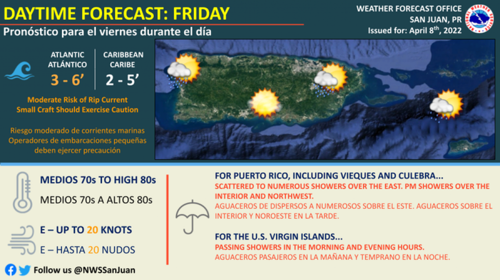 Se espera que la actividad de aguaceros se torne localmente numerosos durante horas de la mañana a medida que un parcho de humedad continúa moviéndose sobre el área, afectando mayormente sectores del este de Puerto Rico. Esta actividad se moverá a través del interior y noroeste de Puerto Rico durante la tarde. Las temperaturas máximas estarán de medios a altos 80s en áreas costeras, y de medios a altos 70s en áreas más altas. Vientos estarán del este sureste de hasta 15 a 20 mph con variaciones en la brisa marina y ráfagas más fuertes en ocasiones.