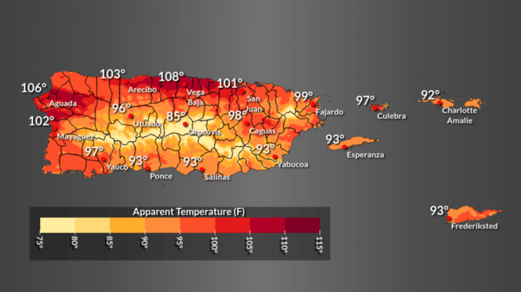 Según el SNM, se espera que los índices de calor varíen entre 102 y 111 grados Fahrenheit en las zonas de baja elevación de Puerto Rico, desde el oeste de San Juan hasta el valle del río Culebrinas cerca de Moca.