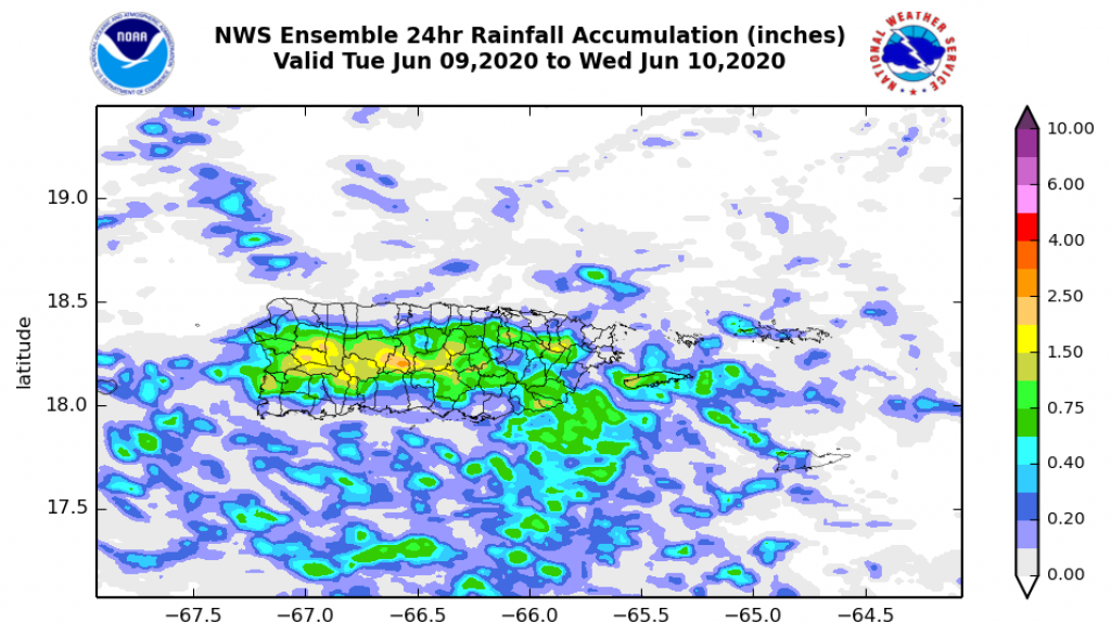 Esta mañana la actividad de lluvia es limitada, tan solo hay algunas lloviznas hacia sectores del este; sin embargo, en nuestra cercanía hay una vaguada y una onda tropical. Como resultado, luego de que caliente el día, el área metro observará la formación de un aguacero (desde el área de El Yunque), alrededor del mediodía. Mientras, otros más numerosos y tronadas se formarán a lo largo del interior, mitad oeste y porciones del sur de la isla en el transcurso de la tarde. Considere la posibilidad de inundaciones urbanas y derrumbes menores.