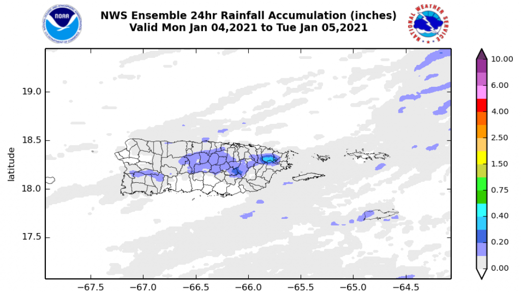 Un sistema de alta presión promueve condiciones del tiempo estables (buen tiempo). Por tal razón, gran parte de la isla continúa con temperaturas frescas y actividad de lluvia limitada. Son los municipios del norte y este del país los que reciben algunos chubascos esporádicamente, pero estos no dejan acumulaciones significativas.