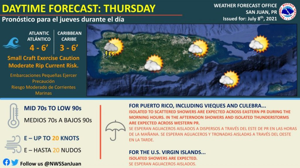 Para este jueves en la mañana se esperan aguaceros dispersos a través del este de Puerto Rico, mientras que en la tarde se anticipan lluvias y tronadas aisladas en el oeste de la Isla, informó la oficina en San Juan del Servicio Nacional de Meteorología (SNM).