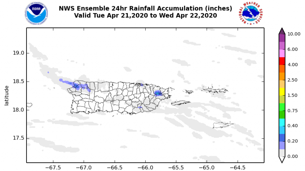 Entretanto, las condiciones marítimas reportan olas de 3 a 5 pies a través de las aguas del Atlántico y de 2 a 5 pies en el Caribe. Hay una peligrosidad moderada de corrientes submarinas a través de la costa norte de Puerto Rico y de Culebra.