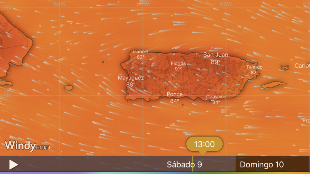 Condiciones meteorológicas mayormente secas, temperaturas muy calurosas y bruma continúan en control de nuestra zona. Los modelos sugieren poca o ninguna actividad de lluvia a través del país, con solo baja probabilidad entre Mayagüez y Rincón, esta tarde. Las temperaturas estarán entre los altos 80ºF y el rango de los 90ºF, con índices de hasta tres dígitos. ¡Manténgase hidratado!