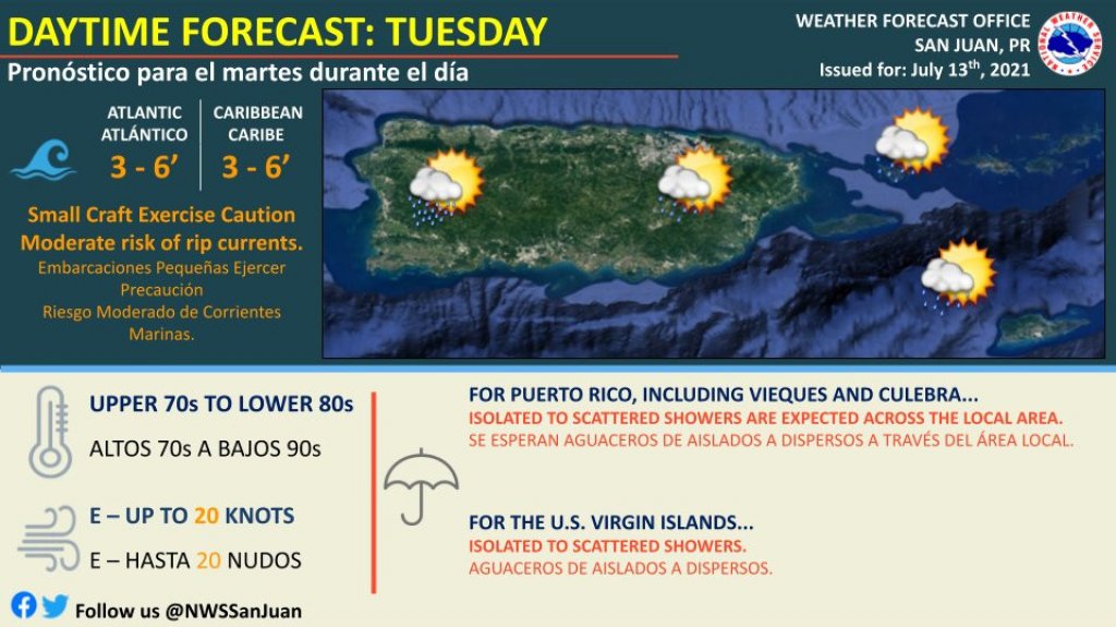 Durante este martes los cielos estarán brumosos y se esperan aguaceros de aislados a dispersos sobre Puerto Rico, informó la oficina del Servicio Nacional de Meteorología (SNM) en San Juan.