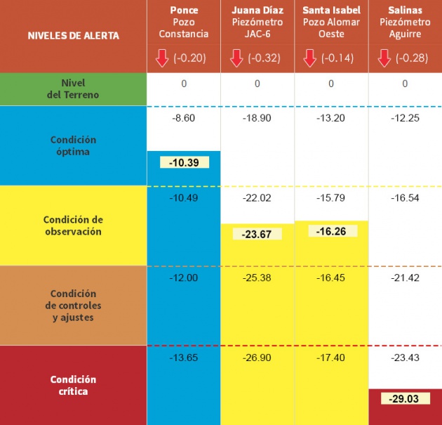 El análisis de los niveles de los acuíferos reflejó que en Ponce, el pozo Constancia es el único que tiene un nivel óptimo con -10.39 pies bajo el terreno, una reducción de 0.20 pies en comparación con la semana anterior. Mientras, el nivel en el piezómetro Jac-6 mostró que el acuífero de Juana Díaz continúa en estado de observación, tras registrar -23.67 pies bajo el nivel del terreno, un descenso de 0.32 pies. El acuífero de Santa Isabel se encuentra en condición de observación, de acuerdo a los niveles registrados en el pozo Alomar oeste con -16.26 pies bajo el nivel del terreno, aunque tuvo un incremento esta semana de 0.14 pies.  Mientras, el sistema de Salinas continúa bajo condición crítica.  El piezómetro Aguirre registró -29.03 pies bajo el nivel del terreno, una disminución de 0.28 pies.  (Ver tabla en el anejo)
