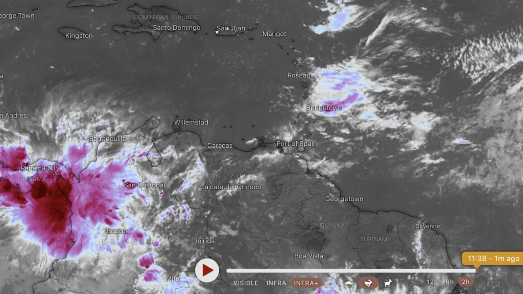 Nubosidad variable y periodos de sol intermitentes dominan en nuestra zona; es decir, el tiempo varía. Estas condiciones son cortesía del viento, que arrastra consigo algunos grupos dispersos de nubosidad hacia el este (incluye área metro) y sectores del sureste el país. En cambio, sectores del oeste e interior-noroeste observarán aguaceros en la tarde. La cobertura e intensidad de lluvia aumentará entre mañana y el lunes, esto asociado a una onda tropical que pasará mayormente al sur. (Imagen del satélite es cortesía de WINDY)