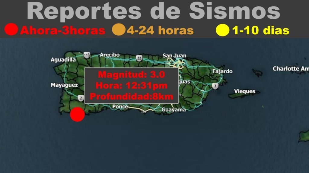 Preliminar: temblor de 3.0 de magnitud al suroeste de Puerto Rico a las 12:31pm reportado por el USGS una profunda de 8km, recuerden es Preliminar puede cambiar a medidas que la Red sismica vaya teniendo los datos de todos los sismógrafos.