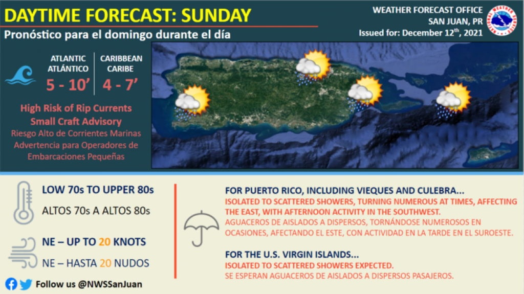 Condiciones marítimas de picadas a peligrosas continuaran a través de las aguas regionales especialmente mar afuera en el Atlántico y el Mar Caribe. Se espera un oleaje de 6-9 pies y vientos de 15-25 nudos durante los próximos días. Como resultado, las Advertencias para los Operadores de Embarcaciones Pequeñas continuarán en efecto. Para las playas, el riesgo de corrientes marinas se mantendrá alto a través de todas las playas expuestas del norte, noreste y sureste de Puerto Rico al igual que para todas las playas de Culebra y Vieques.
