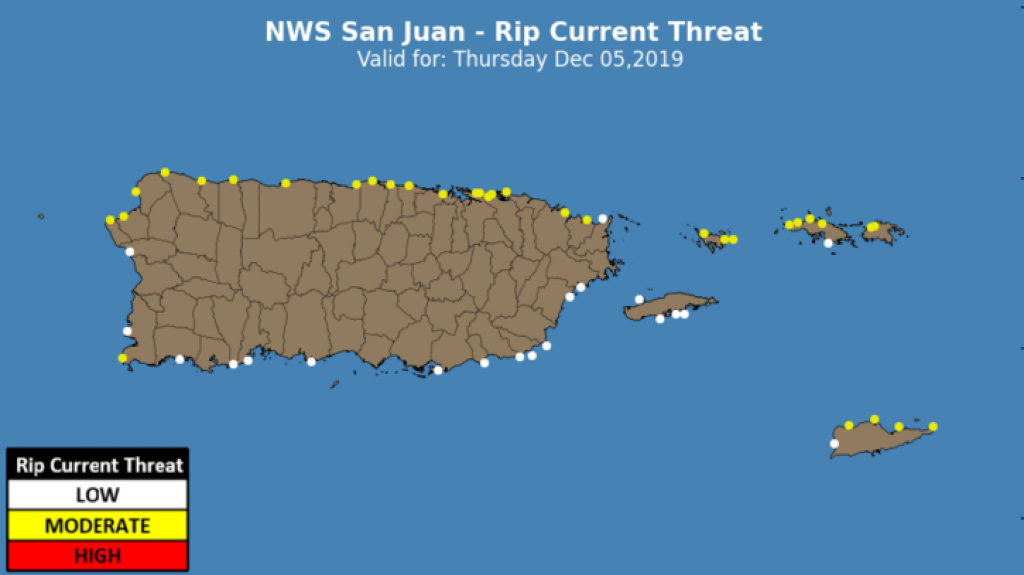 Las condiciones marítimas continúan mejorando gradualmente. Hoy, las olas alcanzan hasta los 5 pies a través del archipiélago; sin embargo, varias playas del oeste, norte y este del país continúan manifestando un riesgo moderado de corrientes submarinas; también en la isla de Culebra. El resto de las costas presenta baja peligrosidad.