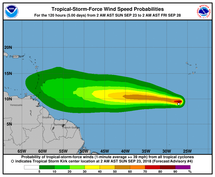La depresión tropical #11 prevalece en ruta al Caribe, muy lenta y desorganizada. En las próximas horas su circulación estará disipándose, lo cual degradaría al sistema como onda tropical. El mismo estará pasando por nuestro archipiélago el martes, incrementando la nubosidad y precipitación. Entretanto, la tormenta tropical Kirk continúa con vientos de 40 mph, desplazándose al oeste. Este sistema podría tener un fortalecimiento gradual hasta finales de semana. Estará en nuestra cercanía el viernes, posiblemente debilitada. Esté pendiente a su evolución. Por otro lado, otra baja presión estará desarrollándose en aguas abiertas del Atlántico, sin amenaza a territorio.