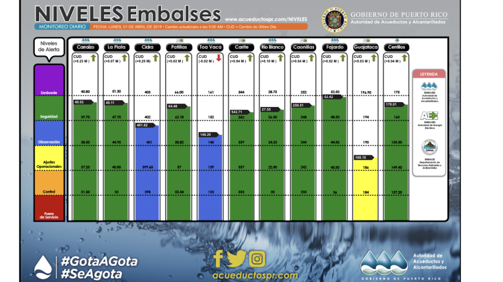 La mayoría de los embalses ha recibido un ligero incremento (en centímetros) a raíz de las precipitaciones manifestadas en las pasadas tardes. De hecho, Guajataca ha visto un aumento de 15 centímetros en los últimos tres días, aunque todavía se encuentra en nivel de ajustes operacionales.