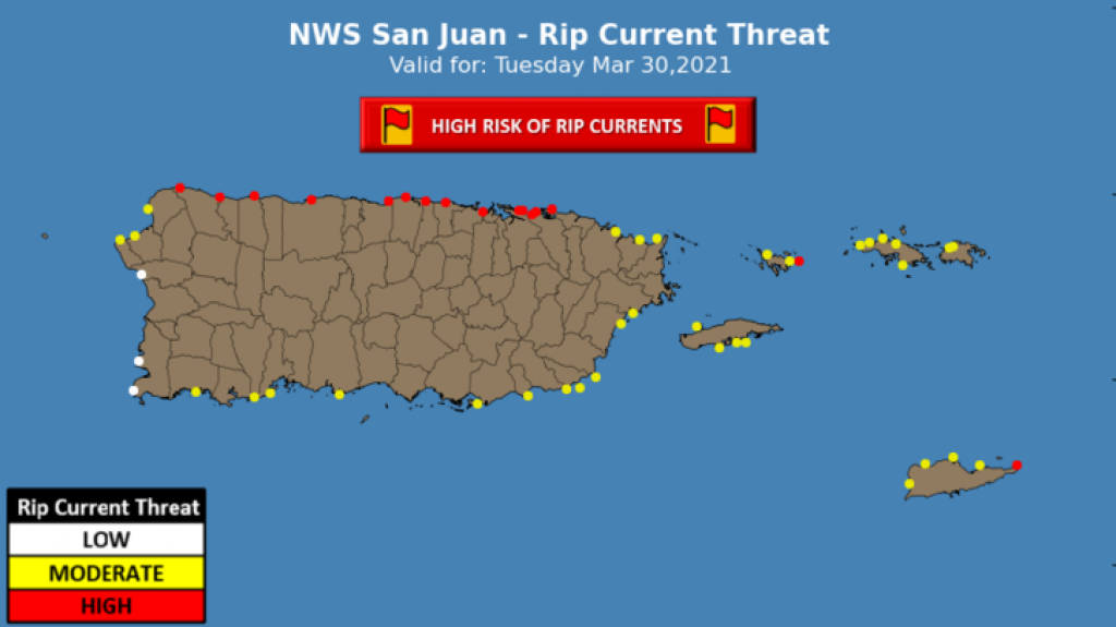 Entretanto el oleaje sigue deteriorado. En el Atlántico hay olas de 5 a 8 pies y en el Caribe de 4 a 7 pies. Hay riesgo elevado de corrientes submarinas y advertencias para operadores de embarcaciones pequeñas. ¡Mucha precaución!