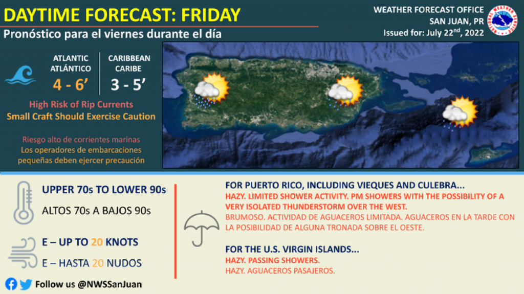 Para hoy se espera un tiempo más seco con algo de polvo del Sahara, reduciendo la claridad del aire. Algunos aguaceros breves continuarán en el este de Puerto Rico durante la mañana.