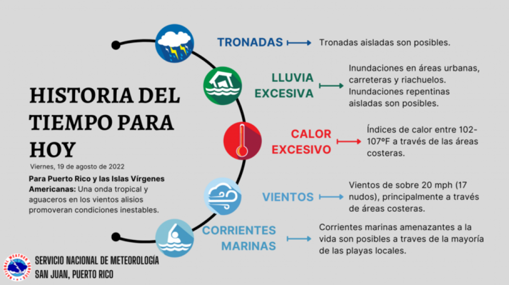 Aguaceros y tronadas de la tarde causarán inundaciones urbanas y de riachuelos. Se espera que los vientos aumenten hoy de 15 a 20 mph, particularmente a través de las áreas costeras del noroeste y suroeste. Las temperaturas máximas deberán fluctuar desde los altos 70 grados en áreas más altas hasta los bajos 90 grados a través de algunas áreas costeras.