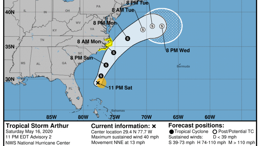 Esta noche, la depresión tropical #1 fue clasificada como la tormenta tropical Arthur. La tormenta, que se ubica justo hacia el este de la costa de Florida, convierte a la temporada de huracanes 2020 como la sexta temporada consecutiva en manifestar un desarrollo temprano (previo) al inicio oficial, puesto a que ésta oficialmente comienza el 1 de junio en la cuenca del Atlántico (incluye al Golfo de México y el Caribe).