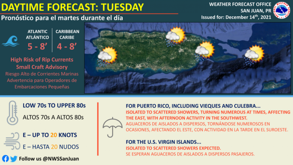 Se espera que para el día de hoy el patrón de tiempo sea similar al de ayer. Se espera que aguaceros dispersos a localmente numerosos continúen a través del día, el noreste de Puerto Rico tendrá la mayor probabilidad de lluvia en la mañana, mientras el suroeste de Puerto Rico observara lluvia en la tarde, con algunas tronadas aisladas en la tarde.