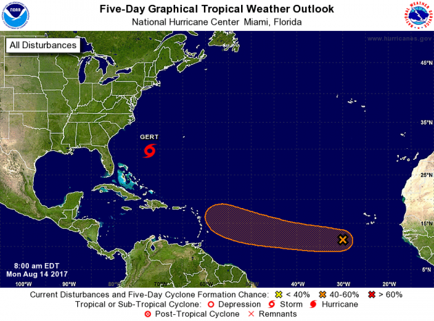 La tormenta tropical Gert se fortalece gradualmente hacia el norte de Las Bahamas, sin rumbo a territorio. Se espera que el fenómeno logre alcanzar la fuerza de huracán categoría 1 a mediados de semana, con un movimiento sobre aguas abiertas del Atlántico. Por otro lado, la fuerte onda tropical al sur-suroeste de Cabo Verde, también conocida como Invest 91L, ha aumentado su potencial ciclónico (20% en 48 horas y 60% en 5 días). Aún no ha madurado ciclónicamente, pues está atada a una baja presión muy amplia, de donde debe surgir un sistema organizado, posiblemente en 48 horas. El modelo GFS (americano) mueve al sistema al noreste del Caribe, el fin de semana; mientras que el ECMWF (europeo) lo ubica en nuestra isla para el sábado. Debemos de estar atentos a su evolución durante el transcurso de la semana.