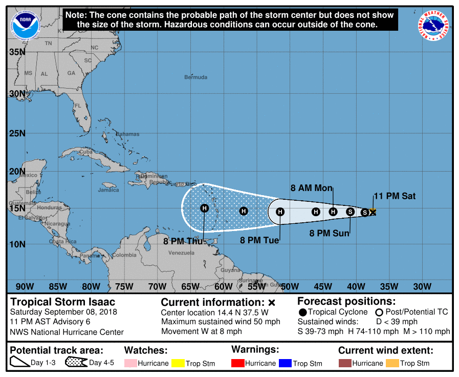 La tormenta Isaac se intensificó, ahora con vientos de 50 mph. Esta se ubica en la latitud 14.4°N y longitud 37.5°O, con vientos de 40 mph. Su movimiento es lento, de apenas 8 mph en dirección oeste. Este sistema podría ser huracán, el lunes, esto a medida que se acerque a las Antillas Menores, el jueves. La mayoría de los modelos proyecta un paso mayormente al sur de P.R. entre jueves en la noche y viernes; sin embargo, prevalece un nivel de incertidumbre bastante elevado. Por tal razón, debemos continuar vigilando su evolución.