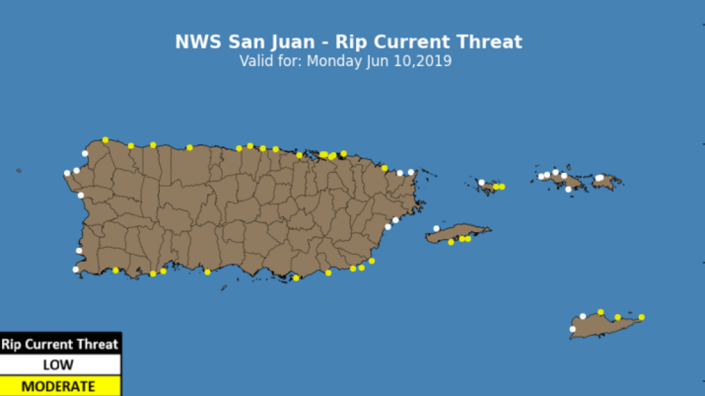 Respecto al oleaje, hay olas de 3 a 5 pies en el Atlántico y de 3 a 6 pies en el Caribe. Hay riesgo moderado de corrientes a lo largo de la costa norte y hacia la costa sur de Puerto Rico, también hacia las islas municipio. Este riesgo es bajo en el resto de las costas; sin embargo, manténgase pendiente ante la posible presencia de tronadas a través del archipiélago.