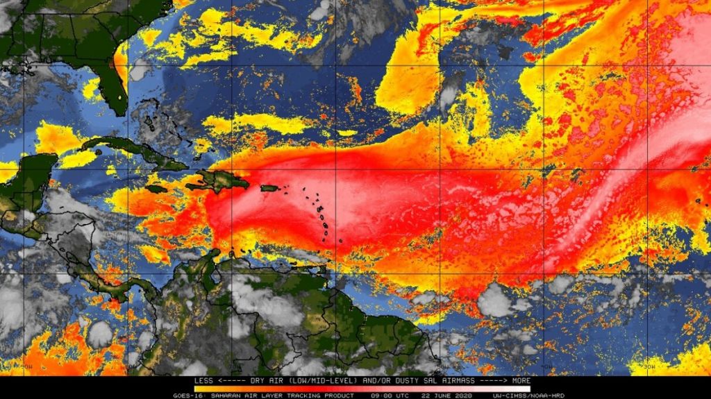 Desde ayer, ha sido más que evidente el gran deterioro en la calidad de aire y limitada visibilidad producto de una capa extensa y densa de polvo del Sahara. Estamos en el momento pico, hoy lunes, con cielos muy opacos. Si padece de alergia, asma o sus sistema respiratorio en general, lo más apropiado será prevalecer dentro de su hogar. De necesitar salir, así sea a su patio, es mejor que use su mascarilla y cubra sus ojos con gafas.