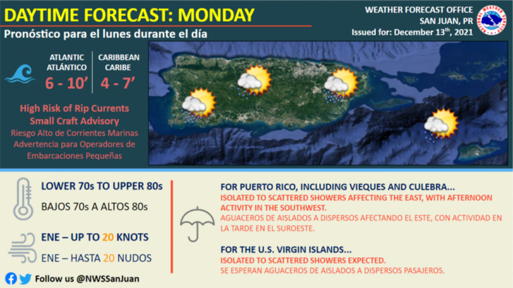 A través de las aguas locales, vientos del este noreste de 15 a 20 nudos con ráfagas más fuertes, están creando condiciones marítimas picadas a peligrosas. El oleaje estará de entre 5 y 8 pies para las aguas costeras del norte de Puerto Rico, el pasaje de Mona y las aguas mar afuera del Caribe, y de hasta 10 pies para las aguas mar afuera del Atlántico.
