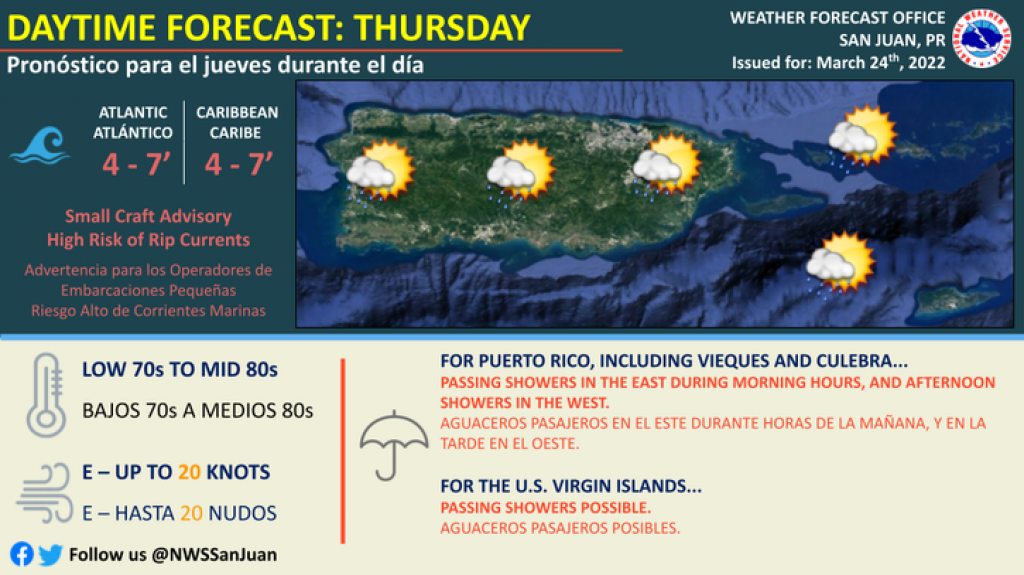 En las aguas regionales, los navegantes pueden esperar vientos del este alrededor de 20 nudos y mar picado de hasta 7 pies. Como resultado, las advertencias para los operadores de embarcaciones pequeñas están vigentes para las aguas mar afuera y pasajes locales. Continuará un alto riesgo de corrientes de marinas en la mayoría de las playas de Culebra, Vieques y Puerto Rico, excepto en las playas del centro-sur, suroeste y oeste de Puerto Rico, donde el riesgo es moderado.