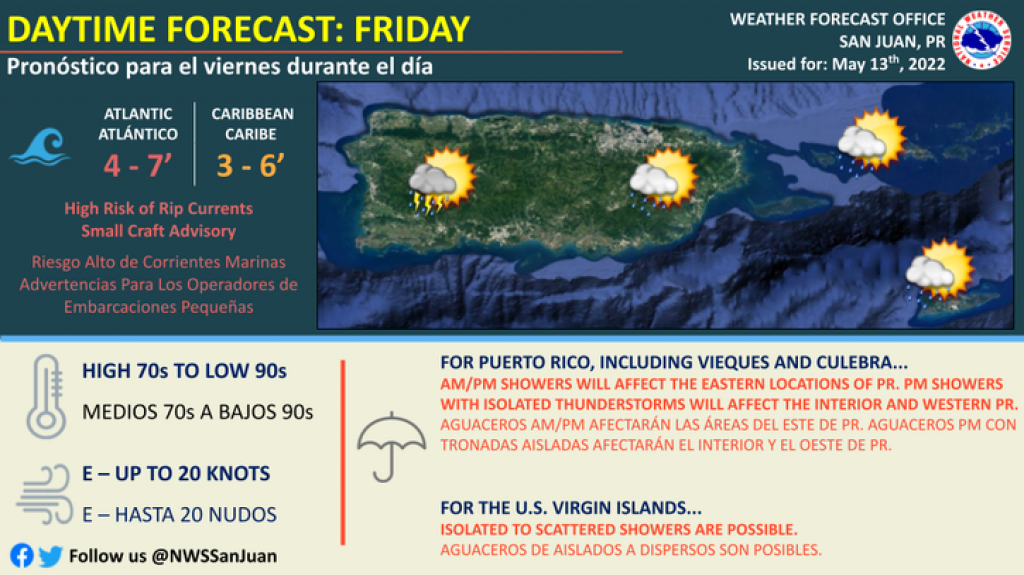 El cielo será de parcialmente a mayormente soleado esta mañana y luego mayormente nublado esta tarde mientras que algunos aguaceros se desarrollan sobre el oeste, noroeste e interior de Puerto Rico. Acumulaciones altas no son esperadas. Será algo ventoso hoy con vientos de 10 a 20 mph con ráfagas hasta 30 mph. Los vientos y las ráfagas más altas serán sobre las costas norte y sur.
