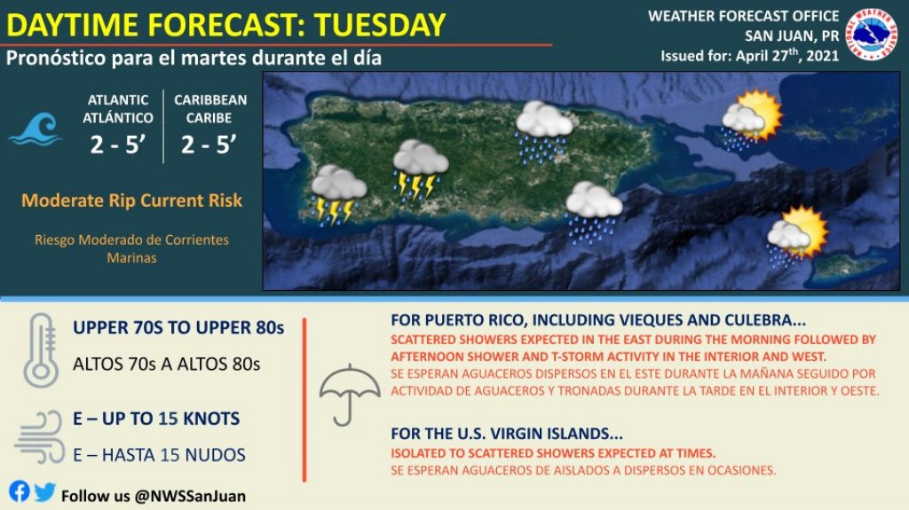En la mañana se esperan aguaceros dispersos en el este de Puerto Rico, mientras que en la tarde se anticipa lluvia y tronadas en el interior y oeste de la Isla.