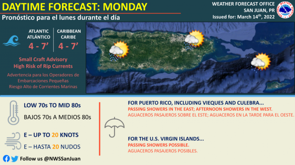 Por lo tanto, existen varias advertencias para los operadores de pequeñas embarcaciones está en efecto para las aguas expuestas del Atlántico y el Pasaje Anegada. Existe un riesgo alto de corrientes a través de la mayoría de las playas expuestas del norte y sureste de Puerto Rico, y la mayoría de las playas de Culebra y Vieques. Los vientos permanecerán del este entre 15 y 20 mph con variación de brisa marina.