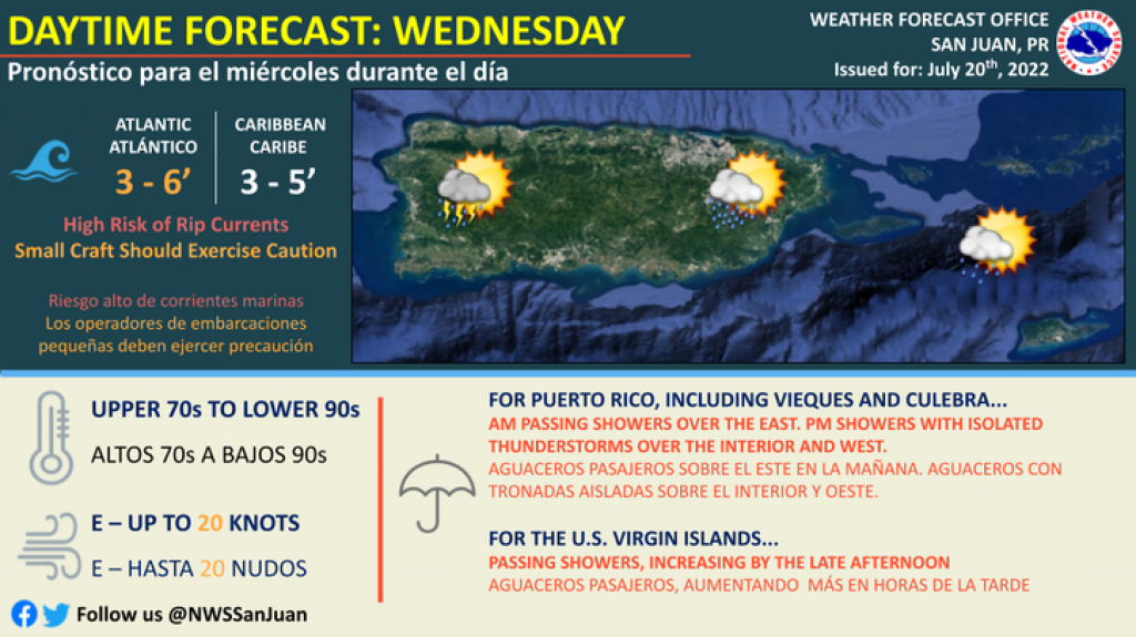 Para hoy, el foco de alguna actividad de lluvia en la tarde deberá moverse mayormente al interior y oeste hacia el noroeste de Puerto Rico, donde los aguaceros con tronadas aisladas podrán traer lluvia moderada a localmente fuerte.
