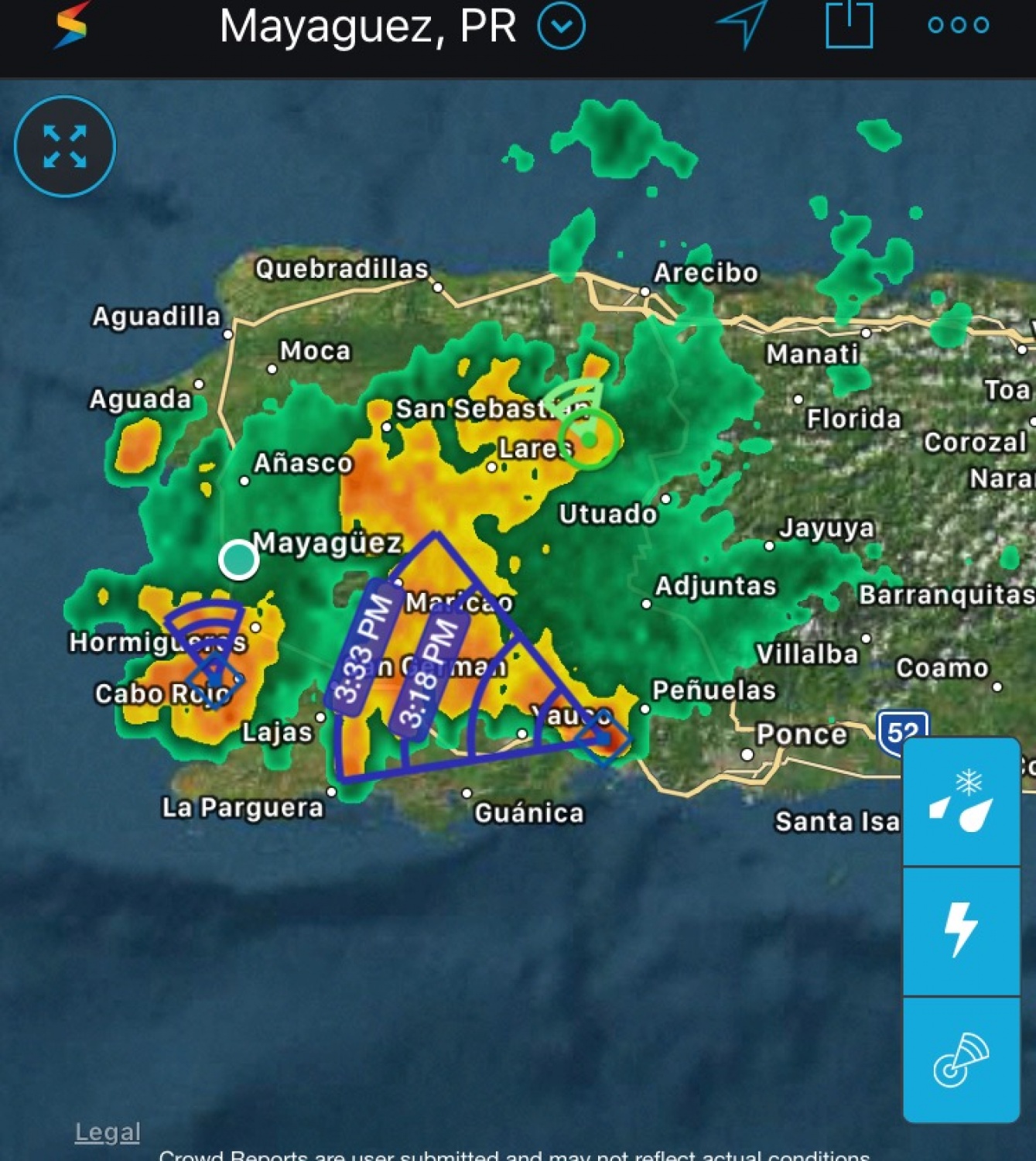 Esto se debe al calor del día en combinación con la humedad que provee un sistema frontal. Como la semana pasada tuvimos abundante precipitación, asociada a una Vaguada, los suelos están muy saturados, así que el potencial de inundaciones y derrumbes en la mitad Oeste es elevado. Hoy se han manifestado algunos problemas dentro del estacionamiento principal del Recinto Universitario de Mayagüez, y en el "Área de la 15", frente al hospital Metropolitano de Cabo Rojo.