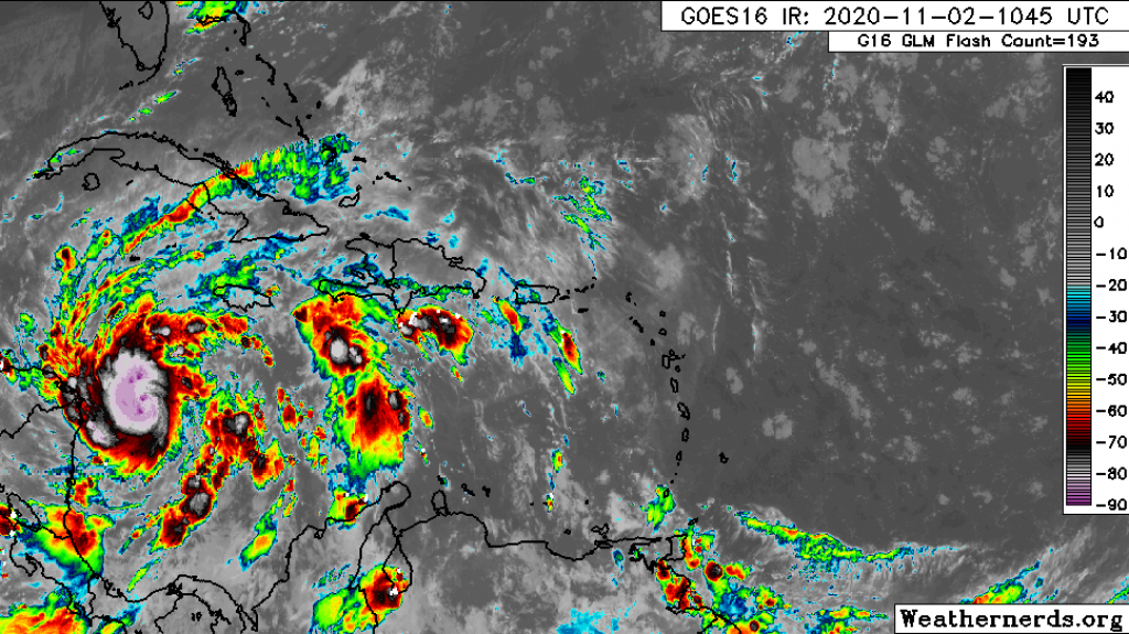 En el trópico, Eta va rumbo a Nicaragua y Honduras, ya es huracán. El pronóstico apunta a que será huracán categoría 2 (casi 3) cuando llegue a esas áreas, en la madrugada del martes (mañana a.m.). Eventualmente puede ser de interés para Cuba, Florida y la Península de Yucatán o un nuevo sistema estaría surgiendo en esa área. Pendientes a este pronóstico complejo.