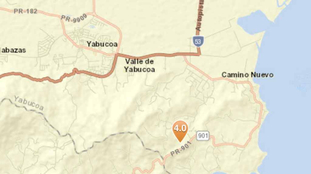 Un temblor de magnitud 4.0 se reportó a eso de las 9:10 pm, en el municipio de Yabucoa. Este sismo fue ampliamente sentido a través de la mitad este y porciones del sur del país.