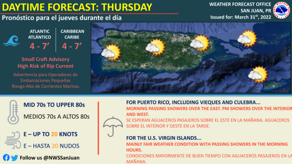 Aguaceros dispersos y un poco de nubes bajas continuarán durante las horas de la mañana. Para esta tarde, se puede esperar un aumento en la nubosidad y actividad de aguaceros a través de sectores de las islas debido a la cercanía de una vaguada en los niveles altos. Sin embargo, no se esperan acumulaciones significativas de lluvia debido a condiciones ventosas. Las temperaturas máximas estarán desde los bajos 70 grados a través de las elevaciones altas hasta los altos 80 grados en áreas costeras.