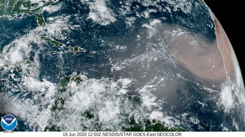 Una gran capa de polvo del Sahara arropa al Atlántico. Esta se mueve gradualmente hacia el Caribe, aunque está interrumpida por humedad asociada a una onda tropical.