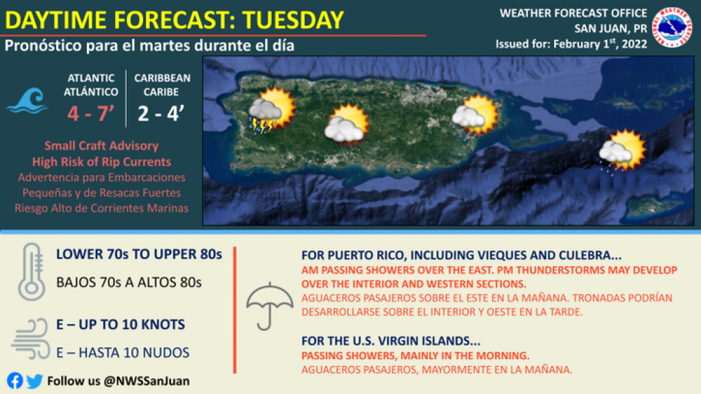 El viento permanecerá del este a cerca de 10 mph o menos durante el día. Este flujo general de vientos favorecerá aguaceros aislados en la mañana para el este de Puerto Rico. Aguaceros de dispersos a numerosos, con tronadas aisladas, se pronostican para las horas de la tarde para el centro al oeste de Puerto Rico a medida que la humedad disponible se combine con el calentamiento diurno y los efectos locales.