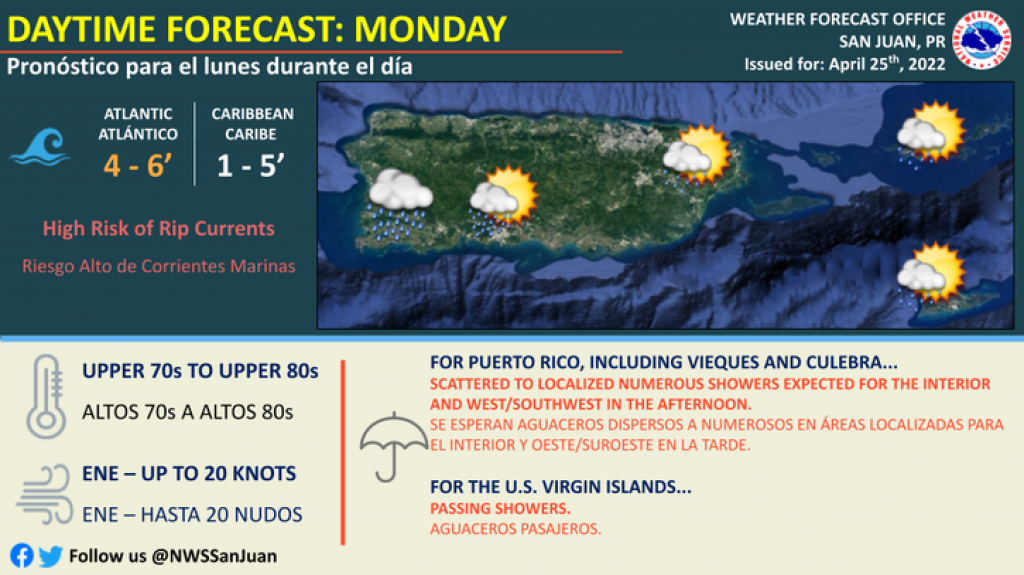 Temperaturas máximas deberán fluctuar desde los altos 80s a través de áreas bajas, especialmente a lo largo de la costa sur y en los bajos 70s a través de áreas altas. Vientos del este a noreste prevalecerá, aumentando hasta los 15 mph con ráfagas más fuertes y variaciones de la brisa marina durante el día.