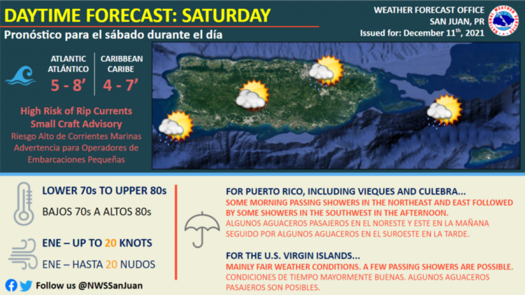 Sin embargo, las condiciones del tiempo se tornarán más húmedas e inestable el domingo y el lunes cuando una vaguada en los niveles altos se mueve sobre el área local. Este patrón resultara en un aumento en los aguaceros a través de sectores del este y norte de Puerto Rico debido a que la humedad se combinara con los vientos fuertes y inestabilidad asociada a la vaguada en la altura.