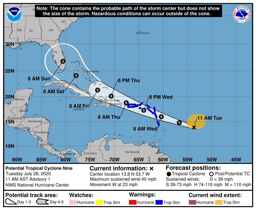 A las 11:00 a.m., el Centro Nacional de Huracanes emitió un AVISO de tormenta tropical para Puerto Rico e islas municipio. Se espera que la onda tropical fuerte, clasificada como el ciclón tropical potencial #9, se convierta en la tormenta Isaías en las próximas horas.