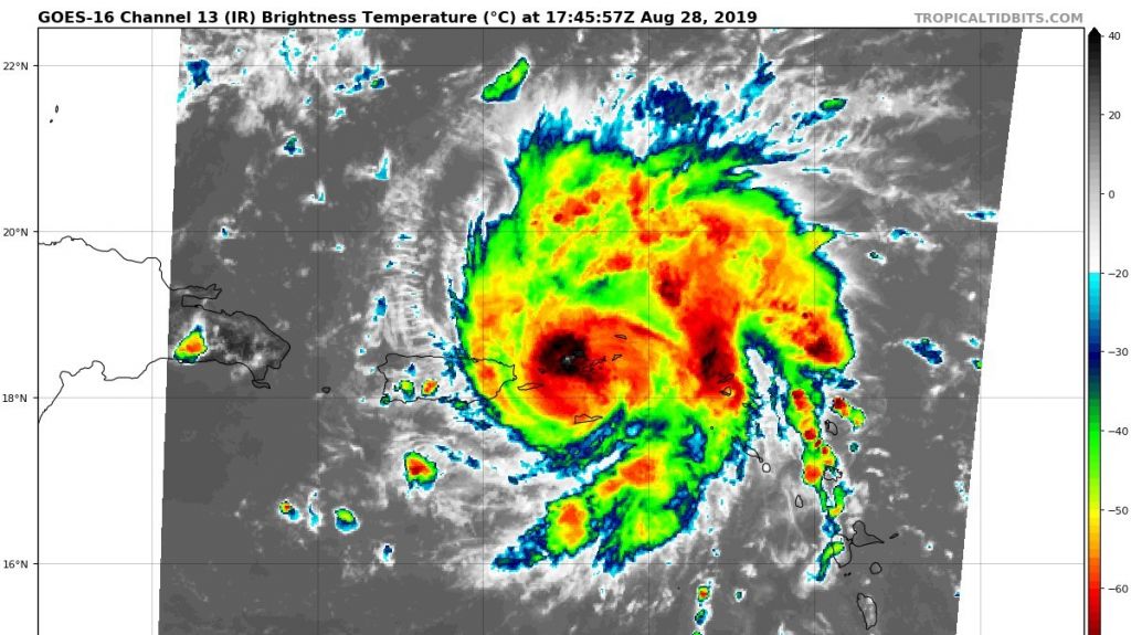 A las 2:00 pm de hoy, miércoles, 28 de agosto el Centro Nacional de Huracanes clasificó a Dorian como huracán categoría 1. El sistema tiene vientos de 75 mph, y se ubica ahora mismo a unas 12 millas aproximadamente al este-sureste de Culebra, moviéndose al noroeste a 13 mph.
