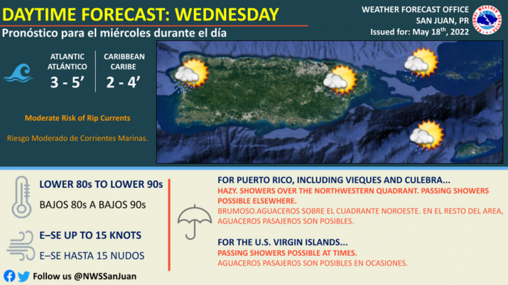 Sin embargo, el contenido limitado de humedad disponible en combinación con los efectos locales causará el desarrollo de aguaceros sobre las secciones del noroeste de Puerto Rico durante la tarde.