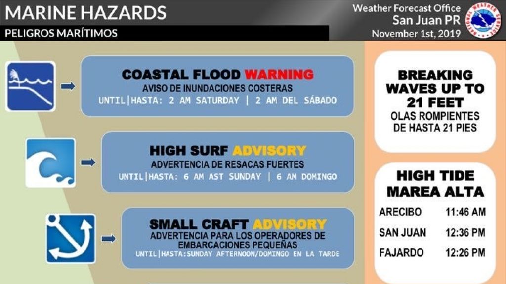 El Servicio Nacional de Meteorología urge a la ciudadanía a estar fuera de las playas dado a la peligrosidad que se manifiesta. Hoy, tendremos olas de 8 a 10 pies del altura a través del archipiélago, con rompientes de 15 a 21 pies. Además, las costas del Atlántico, este del país e islas municipio presentan un riesgo alto de corrientes submarinas. Así que, a lo largo de las costas entre Rincón y Ceiba, Vieques y Culebra debe ejercer mucha cautela, no solo por corrientes, sino también por inundaciones costeras. Entretanto, operadores de embarcaciones pequeñas tienen advertencia a través de las aguas adyacentes.