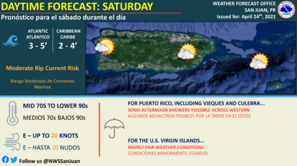 Para hoy, se pronostican aguaceros de aislados a dispersos para el norte y este de Puerto Rico a medida que humedad remanente se mueva hacia el oeste. Para horas de la tarde, se espera tiempo mayormente estable a través del este de Puerto Rico, pero los sectores del oeste observaran actividad de aguaceros dispersos. Áreas aisladas del oeste de Puerto Rico podrían observar inundaciones urbanas menores en la tarde. Las temperaturas máximas estarán en los altos 80s y cerca de los 90s a través de áreas bajas, y de bajos a medios 80s a través de áreas más altas.